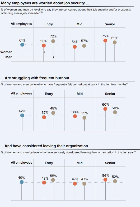 One of the most concerning findings in Women in the Workplace 2025 is how women experience senior roles once they reach them. Burnout and job insecurity are primarily concentrated among senior women, particularly those who have recently stepped into leadership positions.